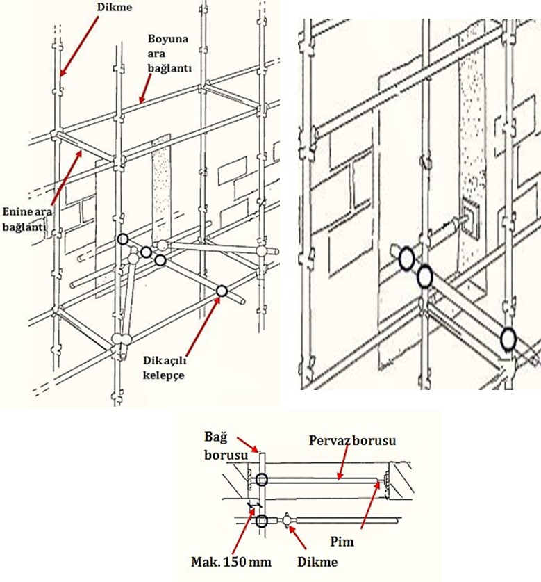 Pencere gibi yapı boşlukları aracılığıyla bağlama yapılması, iskelenin sabitlenmesi için kullanılan diğer bir yöntemdir. Pencere gibi boşlukların iç ve dış taraflarından bulunan borulara dik açılı kelepçeler kullanımı ile bağlama yapılmaktadır. Şekil 63’de bağlama yöntemi gösterilmektedir.