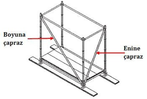 İskele sisteminde bir bütün olarak rijitliğin sağlanması ve yüklerin etkisiyle iskele bağlantı noktalarındaki dik birleşmenin bozulması sonucu oluşabilecek bir yöne eğilmenin önlenmesi için iskele sistemi uygun ve yeterli biçimde takviye edilmelidir. Gerek yatay düzlemde gerekse düşey düzlemde takviye amacıyla kullanılan iskele elemanlarından birisi de çaprazlardır.