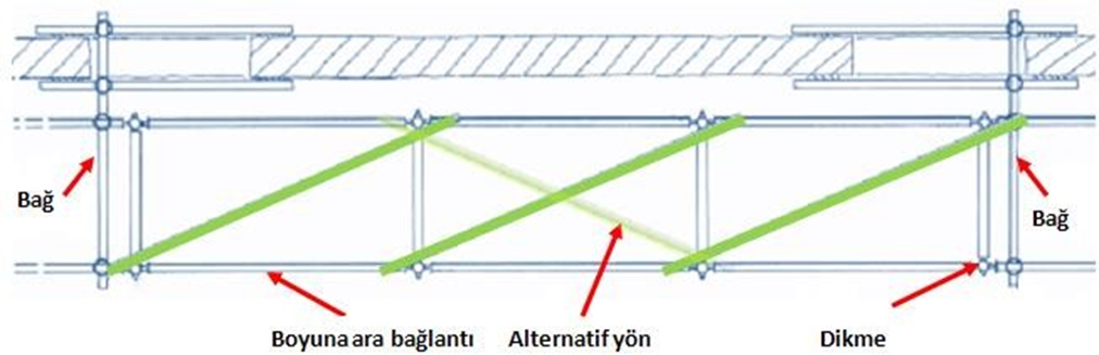 İskelenin yanal yönde bozulmaya karşı dengelenmediği durumlarda yatay düzlemde takviye kullanılmalıdır. Üreticinin tavsiye ettiği aralıklar doğrultusunda yapıya bağlama yapılamadığında, komşu bağlar arasına yatay çaprazlar yerleştirilebilir. Bu işlem yapılırken mevcut bağlar üzerindeki yüklerin de artacağı göz önünde bulundurulmalıdır. Şekil 69’da yatay düzlemde takviye gösterilmektedir: