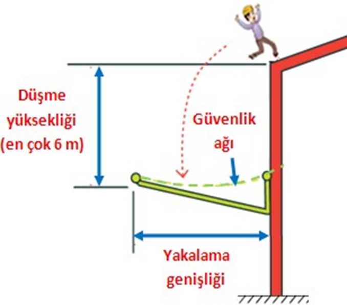 Çalışan kişi hareket ettiği sırada bir yere takılırsa, aşağı doğru düşmenin yanı sıra ileri doğru bir düşmeye de maruz kalmaktadır. İleri doğru düşme mesafesi, düşme yüksekliğinden etkilenmektedir. Çalışma platformunun kenarında koruma sağlayan güvenlik ağları, düşen kişinin ileri doğru hareketini kapsayacak şekilde geniş olmalıdır. Çalışma platformunun kenarı ile güvenlik ağının dış kenarı arasındaki net genişlik, yakalama genişliğini ifade etmektedir (Şekil 3.17) (30).