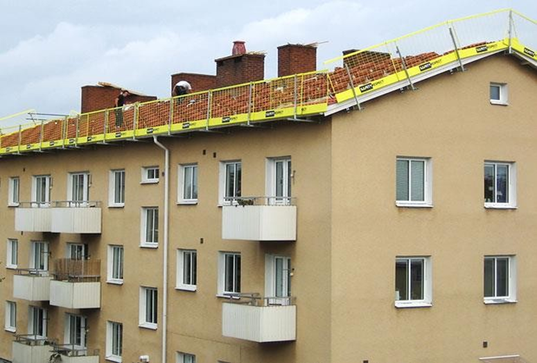Şekil 5.7’de yürütülmekte olan çatı çalışmasının güvenli bir şekilde sürdürülebilmesi için boşluk kalmayacak şekilde çatı kenarları boyunca kenar koruma sistemleri yerleştirilmesi ve düşmeye karşı koruma sağlanması gösterilmektedir.