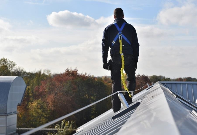 Eğimli çatıda yapılacak çalışmanın güvenli şekilde yapılabilmesi, planlama aşamasında monte edilen yatay yaşam hattı ve ankraj noktaları aracılığı ile sağlanmıştır. Çalışan tam vücut kemer sistemi giyerek lanyard ile hatta bağlantısını sağlamıştır (Şekil 5.8)