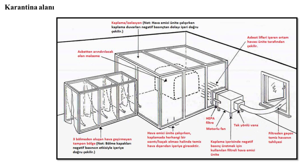 Yüksek lif konsantrasyonlarının olması muhtemel çalışma alanlarında (siyah alan), asbest sökümünün kontrollü yapılabilmesi için karantina kurulması zorunludur. Bu karantina alanı, asbest söküm işleri, atık paketleme ve söküm yerinin temizliği işlemleri sırasında asbest liflerinin etrafa yayılmasını engelleyerek, çevredeki diğer insanların ve çalışanların asbeste maruziyetini önlemektedir. Karantina alanı Şekil 15’de gösterilmektedir.