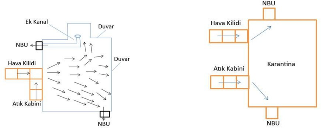 Her iki şekilde duvarlardan dolayı hava kilitlerinin karşısına NBU yerleştirilememiştir. Bu yüzden dolayı ek kanal oluşturularak NBU’nun verimi artırılmıştır. Bu şekilde karantina alanının her noktasına hava akımı sağlanmıştır.