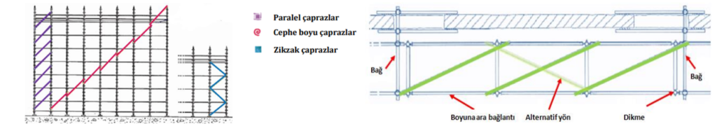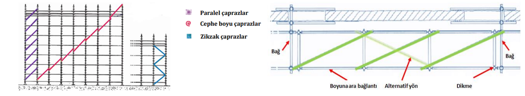 İlgili rehberde, iskelenin tek bir modelde boyuna çapraz içermesi ve çaprazlarla takviyenin üreticinin talimatlarına uygun şekilde yapılması gerektiği belirtilmektedir. Sistem iskelelerde tavsiye edilen maksimum boyuna çapraz açıklığı ile ilgili olarak, bu mesafenin çapraz içermeyen 3 çıkma uzunluğu (boyuna ara bağlantı mesafesi) ile 8 çıkma uzunluğu arasında değiştiği ve bu mesafenin kullanılan sisteme bağlı olduğu ayrıca üreticinin kurulum kılavuzuna da başvurulması gerektiği belirtilmektedir. (Zikzak modele dört kat sınırlaması getirmeyen düzenlemelerde mevcuttur.) Çaprazlar boyuna ara bağlantı ve dikme birleşim noktalarına mümkün olduğunca en yakın noktadan bağlanmalıdır. Enine çaprazlarla ilgili, Kanada Altyapı İşlerinde Sağlık ve Güvenlik Birliği kaynaklarında, sistem iskelelerinin uç kenarlarından enine çaprazlarla desteklenmesi ve aralıklarının üretici talimatlarına göre belirlenmesi gerektiği belirtilmiştir. İskelenin yanal yönde bozulmaya karşı dengelenmediği durumlarda yatay düzlemde takviye kullanılmalıdır. Üreticinin tavsiye ettiği aralıklar doğrultusunda yapıya bağlama yapılamadığında, komşu bağlar arasına yatay çaprazlar yerleştirilebilir. Bu işlem yapılırken mevcut bağlar üzerindeki yüklerin de artacağı göz önünde bulundurulmalıdır. Şekil 28’da yatay düzlemde takviye gösterilmektedir
