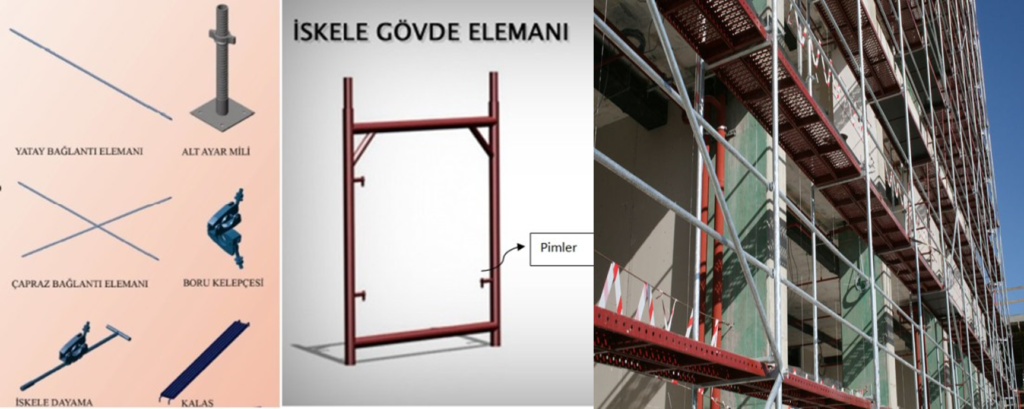 H tipi cephe iskelesi modüllerden oluşur. Her bir modülde; bir adet H çerçeve, iki adet çapraz ve bir adet yatay bağlantı elemanı taşıyıcı kafes sistemini oluşturur.